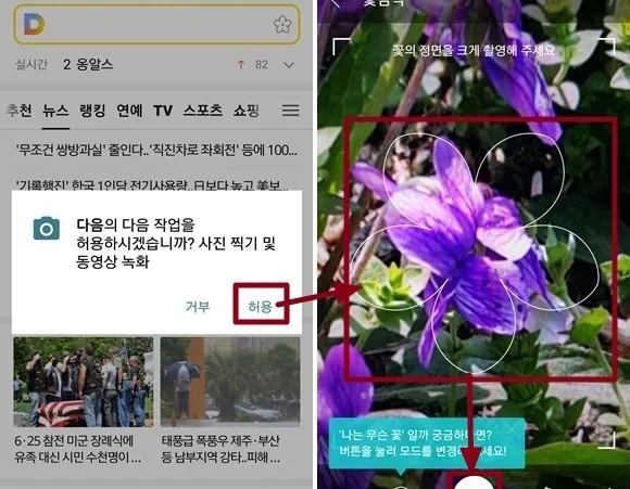 ‘허용’을 누르면 카메라 형태의 꽃 검색 기능이 실행됩니다.